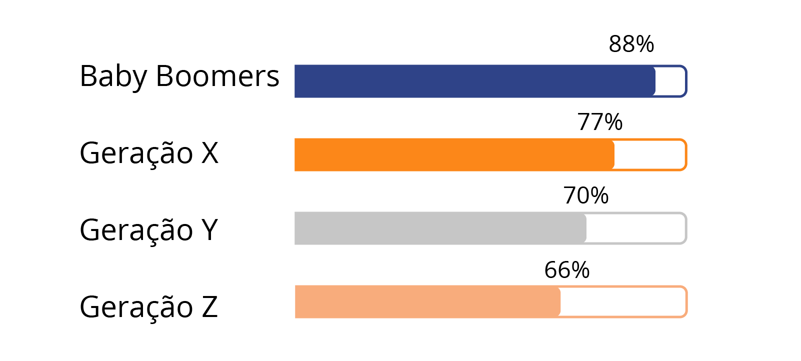 Segundo nossos dados publicados no nosso relatório anual de Panorama da Experiência do Colaborador 2020, a variável "Saúde Mental" foi a que mostrou pior favorabilidade durante a jornada dos colaboradores em 2020. Além disso, essa percepção vai piorando ao passo que as gerações são mais novas, enquanto a favorabilidade dos Baby Boomers é de 88%, a geração Z apresenta apenas 66% de favorabilidade para essa mesma variável, conforme gráfico abaixo.